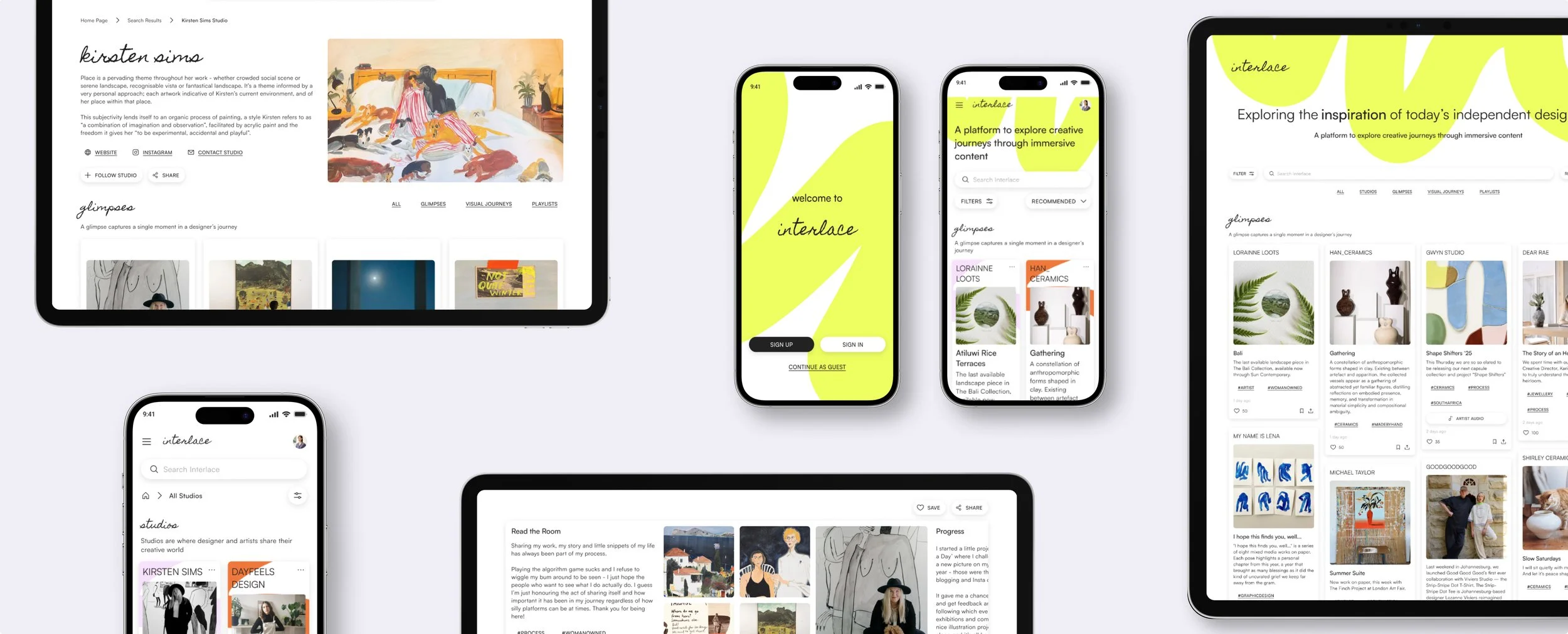 Because interlace was built for an audience with a high visual IQ, the identity had to be as considered as the work it hosts. I drew inspiration from editorial design and photography, utilising a palette of high-energy accents paired with soft neutrals. This balance creates a modern, vibrant atmosphere that remains calm enough to support long-form exploration.
