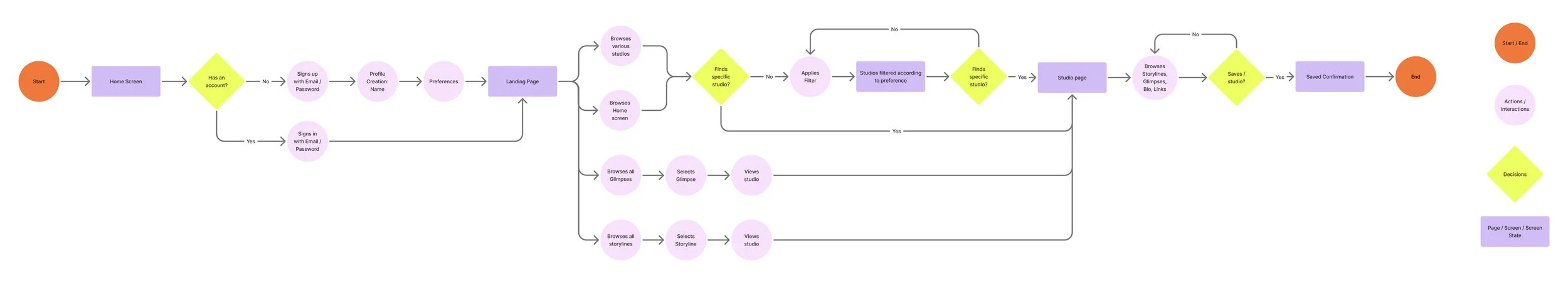The user flow maps the journey of a new audience member exploring Interlace for the first time. It was designed to support browsing, connection, and discovery, not just with the content, but with the creator and the platform itself.