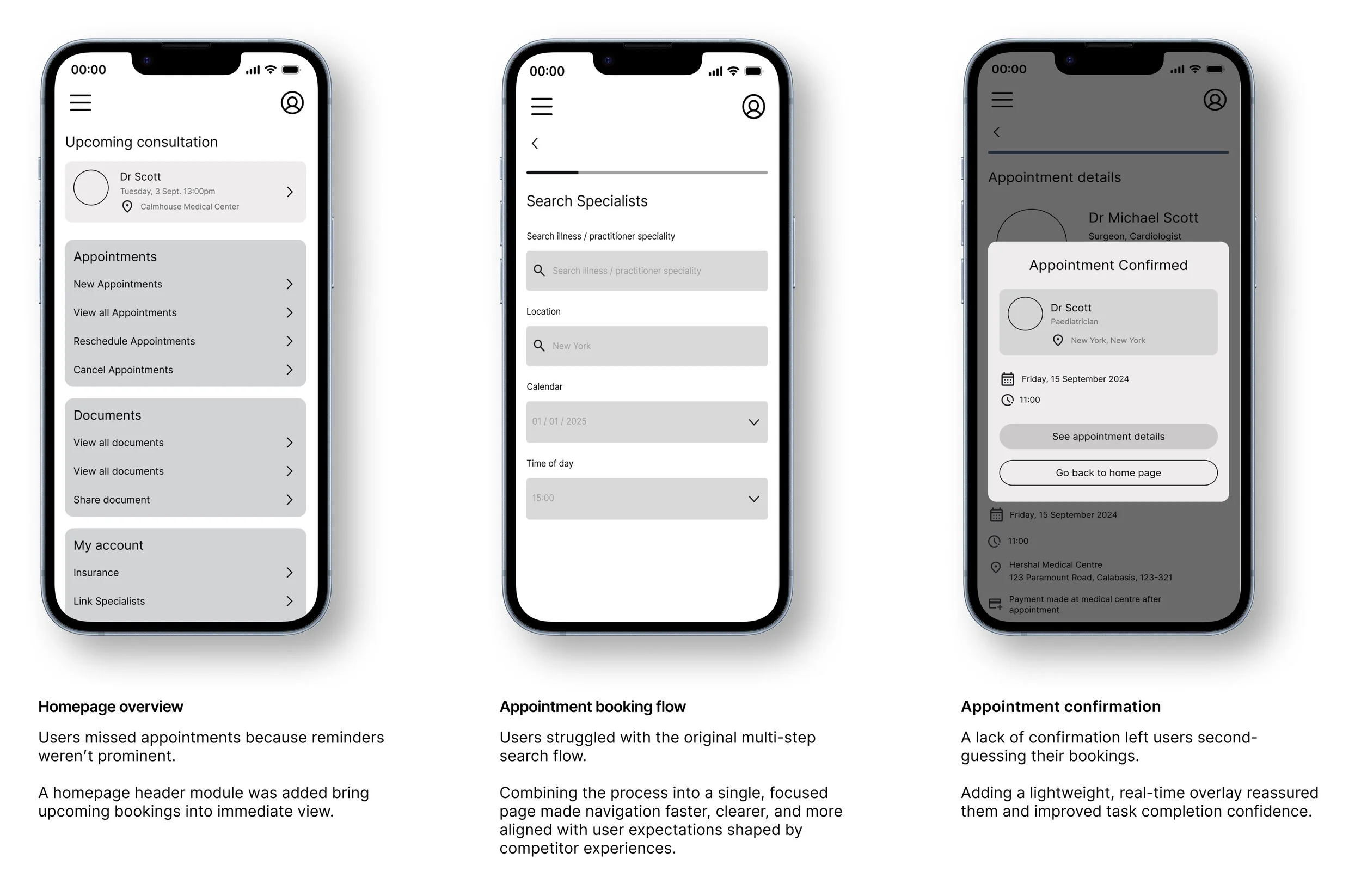 Users expressed uncertainty about whether their appointment had been confirmed. The standalone confirmation page added an extra step without providing meaningful value causing users to hesitate, unsure what to do next.